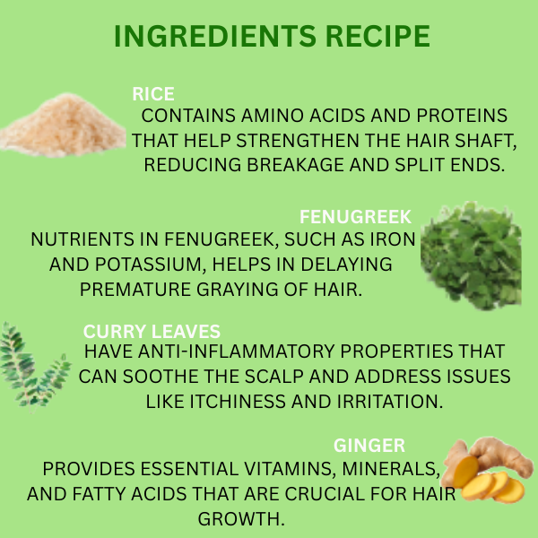 Ingredients - Rice, Fenugreek, Kalonji, Curry Leaves, Aloe Vera, Rosemary, Flax Seeds, Clove, Ginger, Green Tea Leaves.